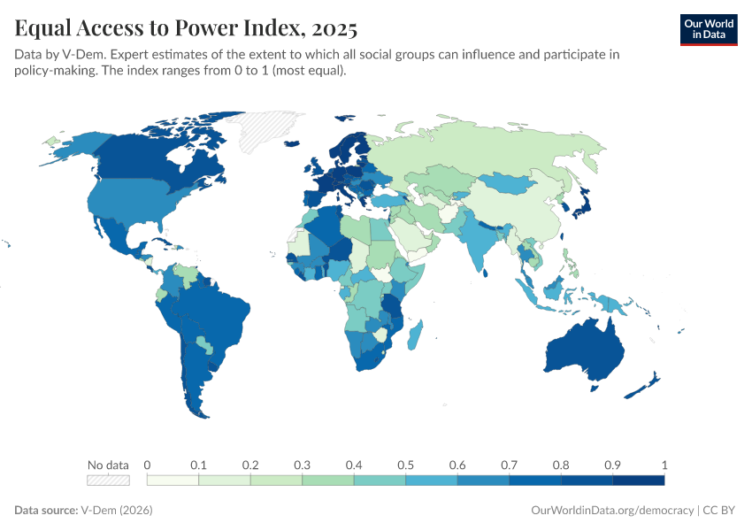 V-Dem (2025) – processed by Our World in Data. “Equal access to power index – V-Dem” [dataset]. V-Dem, “Democracy report v15” [original data]. Retrieved January 5, 2026 from https://search-sync-local-query.owid.pages.dev/grapher/equal-access-to-power-index