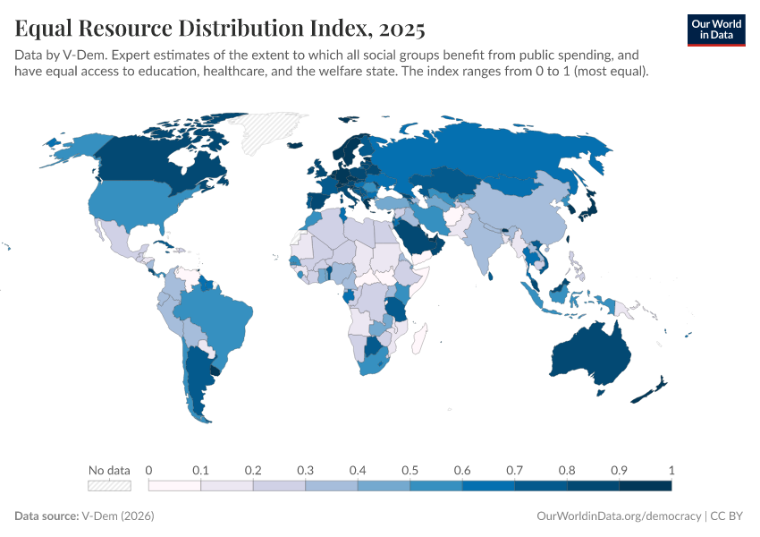 V-Dem (2025) – processed by Our World in Data. “Equal resource distribution index – V-Dem” [dataset]. V-Dem, “Democracy report v15” [original data]. Retrieved January 5, 2026 from https://search-sync-local-query.owid.pages.dev/grapher/equal-resource-distribution-index