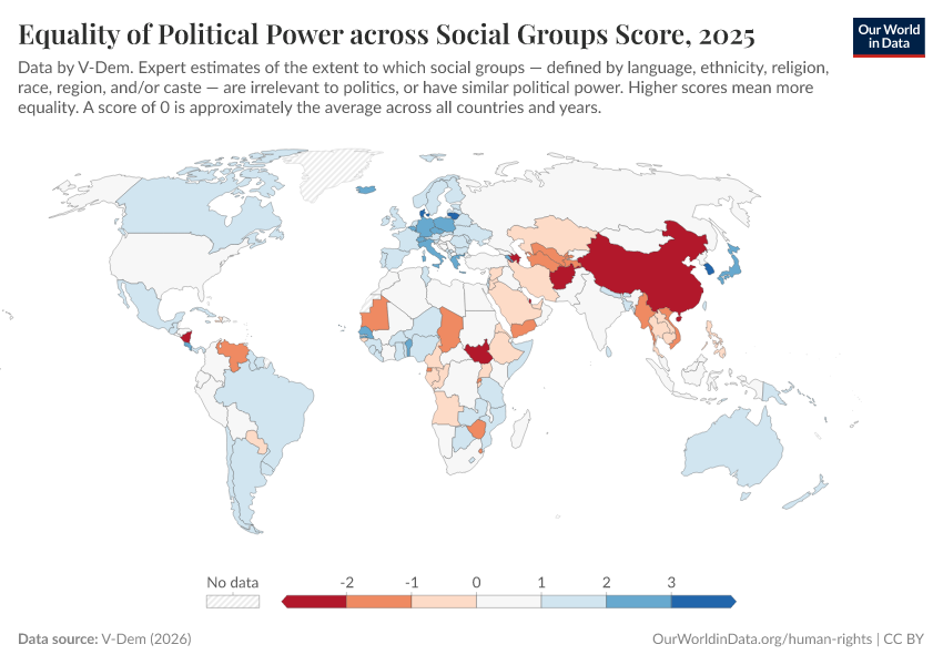 V-Dem (2025) – processed by Our World in Data. “Equality of political power across social groups – V-Dem” [dataset]. V-Dem, “Democracy report v15” [original data]. Retrieved January 5, 2026 from https://search-sync-local-query.owid.pages.dev/grapher/equality-of-political-power-across-social-groups-score