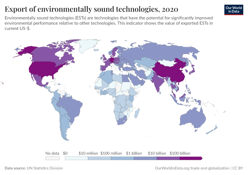 UN Statistics Division – processed by Our World in Data. “Export of environmentally sound technologies” [dataset]. UN Statistics Division, “WESR / UN COMTRADE” [original data]. Retrieved January 5, 2026 from https://search-sync-local-query.owid.pages.dev/grapher/export-of-environmentally-sound-technologies