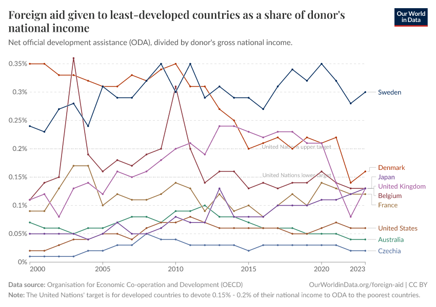“Data Page: Foreign aid given to least-developed countries as a share of donor's national income”. Our World in Data (2026). Data adapted from Organisation for Economic Co-operation and Development. Retrieved from https://search-sync-local-query.owid.pages.dev/grapher/foreign-aid-given-to-least-developed-countries-as-a-share-of-donors-national-income [online resource]How to cite this data
