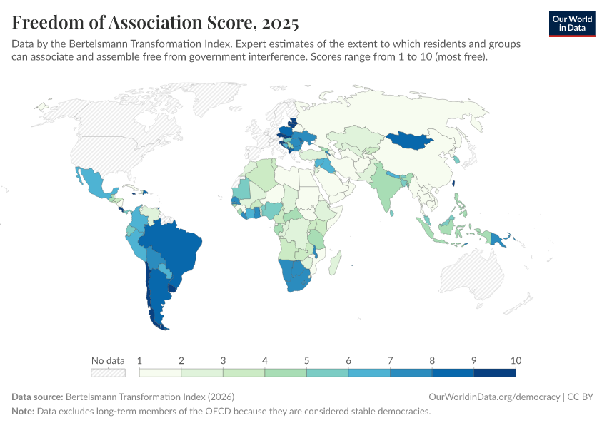 “Data Page: Freedom of association score”, part of the following publication: Bastian Herre, Lucas Rodés-Guirao, and Esteban Ortiz-Ospina (2013) - “Democracy”. Data adapted from Bertelsmann Transformation Index. Retrieved from https://search-sync-local-query.owid.pages.dev/grapher/freedom-of-association-score-bti [online resource]How to cite this data