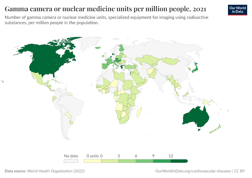 “Data Page: Gamma camera or nuclear medicine units per million people”, part of the following publication: Saloni Dattani, Veronika Samborska, Hannah Ritchie, and Max Roser (2023) - “Cardiovascular Diseases”. Data adapted from World Health Organisation. Retrieved from https://search-sync-local-query.owid.pages.dev/grapher/gamma-camera-or-nuclear-medicine-availability [online resource]How to cite this data