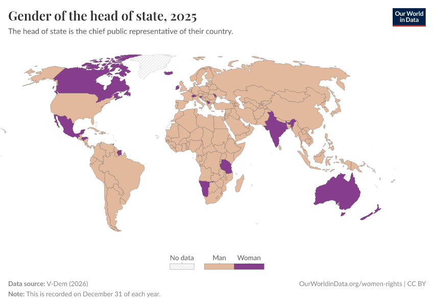 V-Dem (2025) – processed by Our World in Data. “Gender of the head of state” [dataset]. V-Dem, “Democracy report v15” [original data]. Retrieved January 5, 2026 from https://search-sync-local-query.owid.pages.dev/grapher/gender-of-the-head-of-state