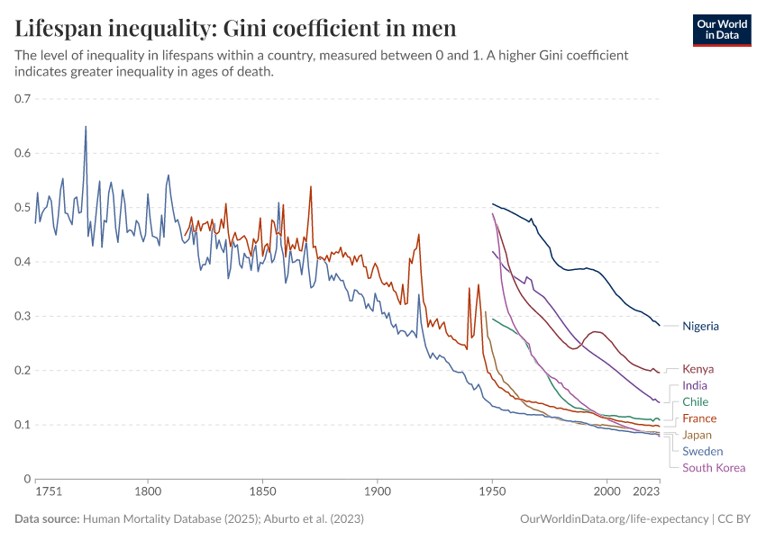 Human Mortality Database (2025); Aburto et al. (2023) – with major processing by Our World in Data. “Lifespan inequality: Gini coefficient in men” [dataset]. Human Mortality Database, “Human Mortality Database”; United Nations, “World Population Prospects” [original data]. Retrieved January 5, 2026 from https://search-sync-local-query.owid.pages.dev/grapher/gini-coefficient-of-lifespan-inequality-in-males