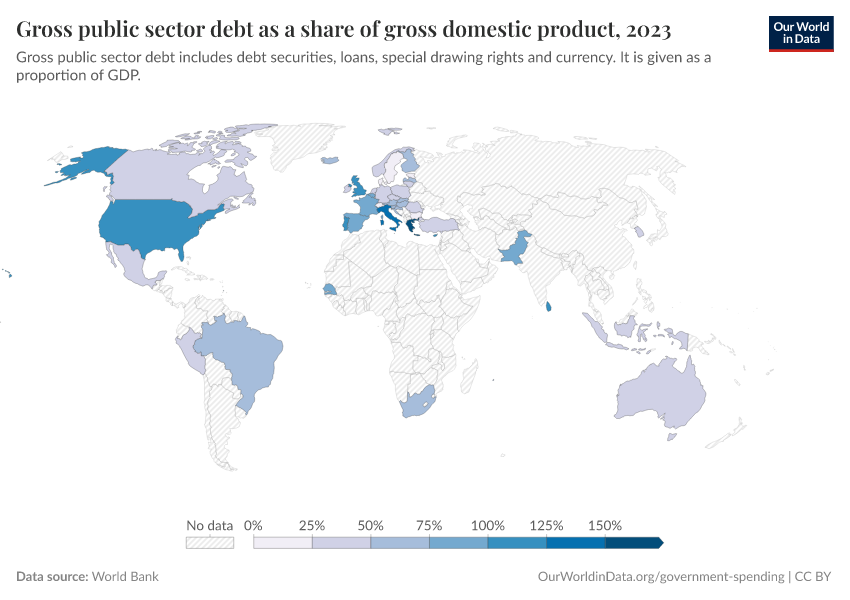 “Data Page: Gross public sector debt as a share of gross domestic product”. Our World in Data (2026). Data adapted from World Bank. Retrieved from https://search-sync-local-query.owid.pages.dev/grapher/gross-public-sector-debt-as-a-proportion-of-gdp [online resource]How to cite this data