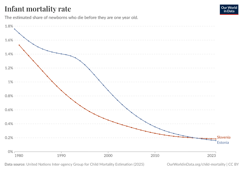 United Nations Inter-agency Group for Child Mortality Estimation (2025) – with major processing by Our World in Data. “Infant mortality rate” [dataset]. United Nations Inter-agency Group for Child Mortality Estimation, “United Nations Inter-agency Group for Child Mortality Estimation”; Various sources, “Population” [original data]. Retrieved January 5, 2026 from https://search-sync-local-query.owid.pages.dev/grapher/infant-mortality