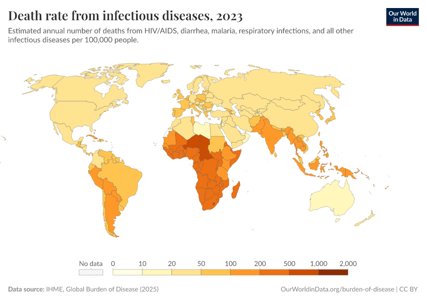 IHME, Global Burden of Disease (2024) – with minor processing by Our World in Data. “Death rate from infectious diseases” [dataset]. IHME, Global Burden of Disease, “Global Burden of Disease - Deaths and DALYs” [original data]. Retrieved January 5, 2026 from https://search-sync-local-query.owid.pages.dev/grapher/infectious-disease-death-rates-gbd