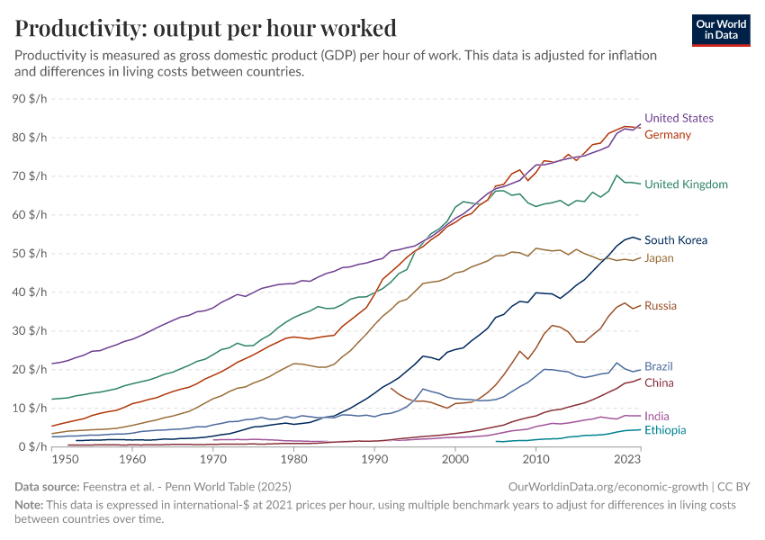 “Data Page: Productivity: output per hour worked”, part of the following publication: Max Roser, Bertha Rohenkohl, Pablo Arriagada, Joe Hasell, Hannah Ritchie, and Esteban Ortiz-Ospina (2023) - “Economic Growth”. Data adapted from Feenstra et al.. Retrieved from https://search-sync-local-query.owid.pages.dev/grapher/labor-productivity-per-hour-pennworldtable [online resource]How to cite this data