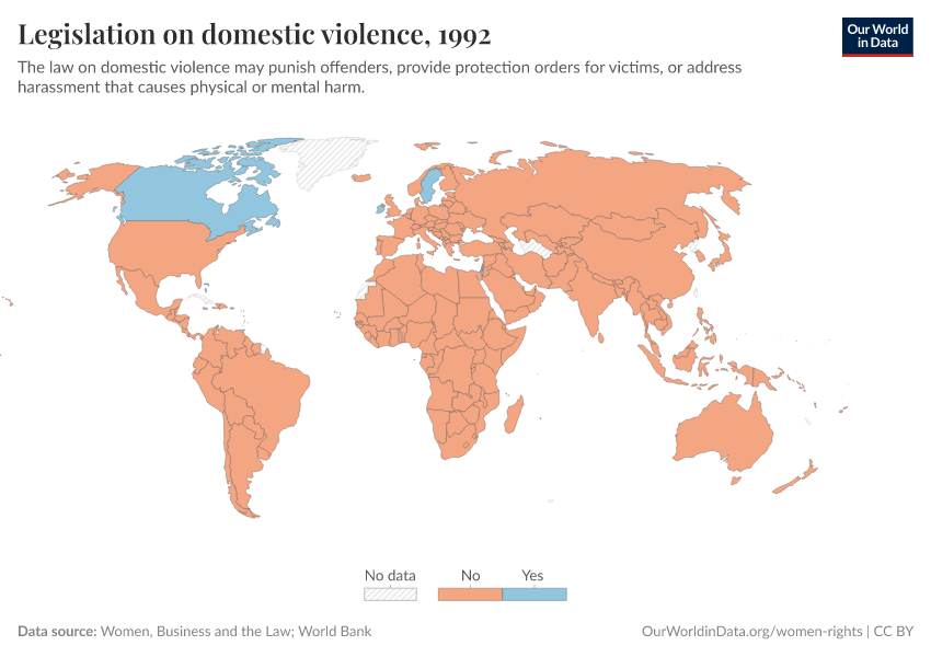 “Data Page: Legislation on domestic violence”, part of the following publication: Bastian Herre, Veronika Samborska, Pablo Arriagada, and Hannah Ritchie (2023) - “Women’s Rights”. Data adapted from World Bank Gender Statistics. Retrieved from https://search-sync-local-query.owid.pages.dev/grapher/legislation-domestic-violence [online resource]How to cite this data