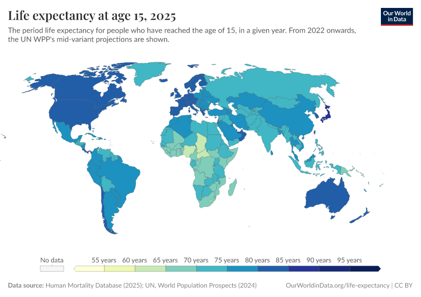Human Mortality Database (2025); UN, World Population Prospects (2024) – with major processing by Our World in Data. “Life expectancy at 15 – HMD, UN WPP – period tables, with UN medium projections” [dataset]. Human Mortality Database, “Human Mortality Database”; United Nations, “World Population Prospects” [original data]. Retrieved January 5, 2026 from https://search-sync-local-query.owid.pages.dev/grapher/life-expectancy-at-age-15