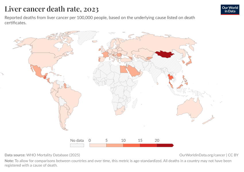 WHO Mortality Database (2025) – with minor processing by Our World in Data. “Liver cancer death rate” [dataset]. WHO Mortality Database, “WHO Mortality Database” [original data]. Retrieved January 5, 2026 from https://search-sync-local-query.owid.pages.dev/grapher/liver-cancer-death-rate