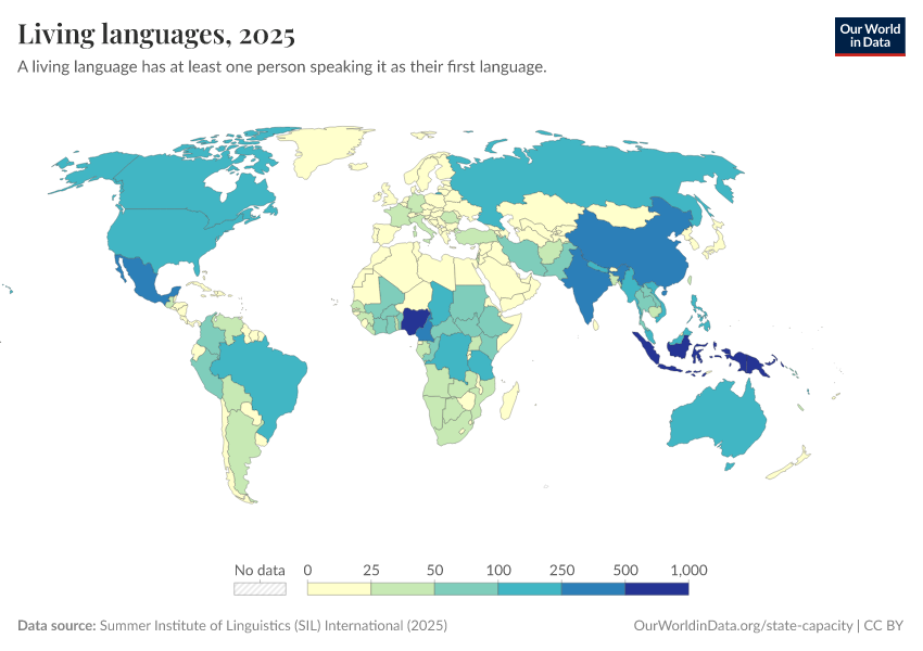 “Data Page: Living languages”, part of the following publication: Bastian Herre and Pablo Arriagada (2023) - “State Capacity”. Data adapted from Summer Institute of Linguistics (SIL) International. Retrieved from https://search-sync-local-query.owid.pages.dev/grapher/living-languages [online resource]