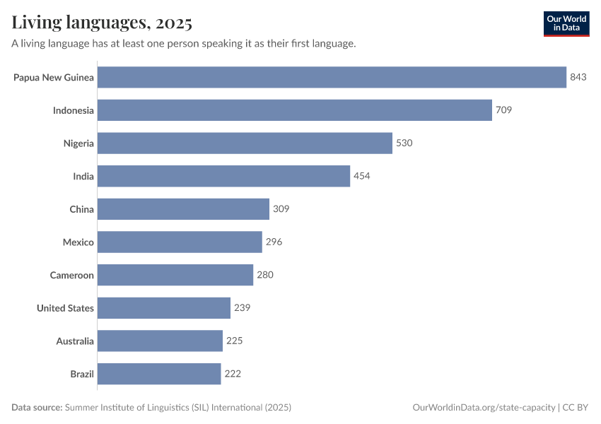 “Data Page: Living languages”, part of the following publication: Bastian Herre and Pablo Arriagada (2023) - “State Capacity”. Data adapted from Summer Institute of Linguistics (SIL) International. Retrieved from https://search-sync-local-query.owid.pages.dev/grapher/living-languages [online resource]How to cite this data