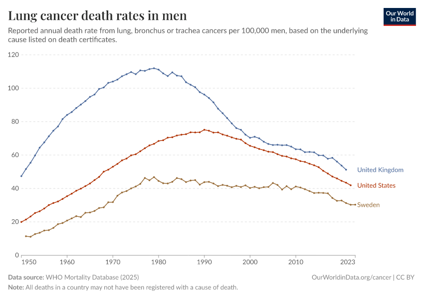 WHO Mortality Database (2025) – with minor processing by Our World in Data. “Lung cancer death rates in men” [dataset]. WHO Mortality Database, “WHO Mortality Database” [original data]. Retrieved January 5, 2026 from https://search-sync-local-query.owid.pages.dev/grapher/lung-cancer-death-rates-males