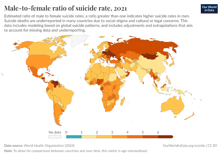 World Health Organization (2024) – with major processing by Our World in Data. “Male-to-female ratio of suicide rate” [dataset]. World Health Organization, “Global Health Estimates” [original data]. Retrieved January 5, 2026 from https://search-sync-local-query.owid.pages.dev/grapher/male-female-ratio-suicides-rates