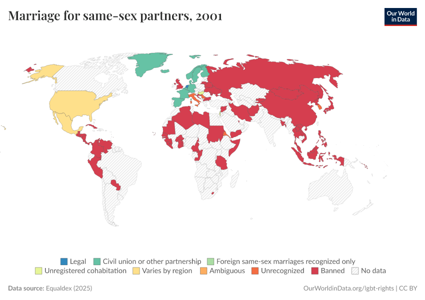 “Data Page: Marriage for same-sex partners”, part of the following publication: Bastian Herre and Pablo Arriagada (2023) - “LGBT+ Rights”. Data adapted from Equaldex. Retrieved from https://search-sync-local-query.owid.pages.dev/grapher/marriage-same-sex-partners-equaldex [online resource]How to cite this data