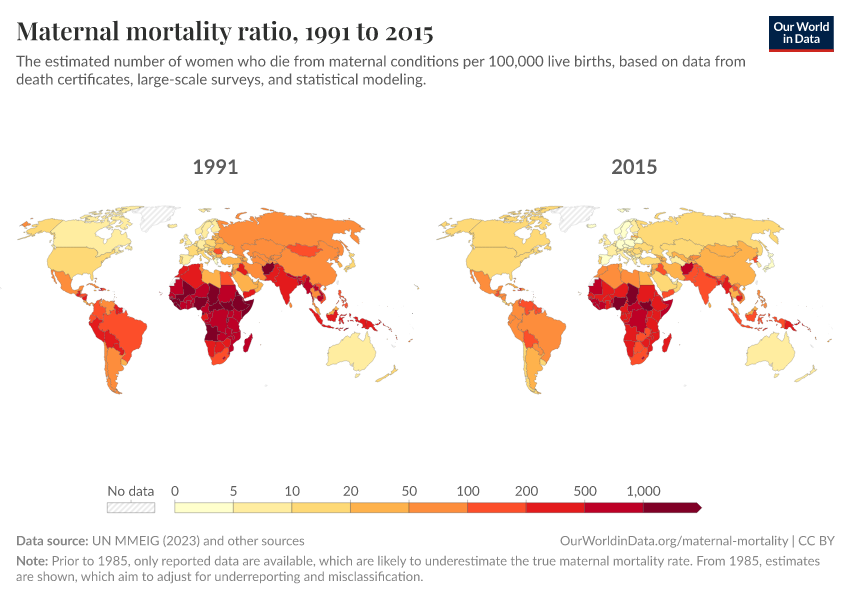 “Data Page: Maternal mortality ratio”, part of the following publication: Max Roser and Hannah Ritchie (2013) - “Maternal Mortality”. Data adapted from UN MMEIG (WHO, UNICEF, UNFPA, World Bank Group and UNDESA/ Population Division), WHO Mortality Database, United Nations, Gapminder. Retrieved from https://search-sync-local-query.owid.pages.dev/grapher/maternal-mortality [online resource]How to cite this data