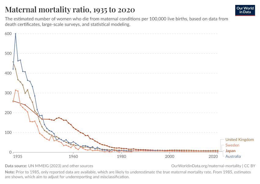 “Data Page: Maternal mortality ratio”, part of the following publication: Max Roser and Hannah Ritchie (2013) - “Maternal Mortality”. Data adapted from UN MMEIG (WHO, UNICEF, UNFPA, World Bank Group and UNDESA/ Population Division), WHO Mortality Database, United Nations, Gapminder. Retrieved from https://search-sync-local-query.owid.pages.dev/grapher/maternal-mortality [online resource]