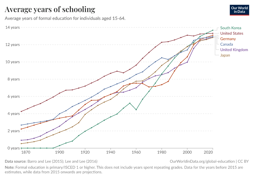 Barro and Lee (2015); Lee and Lee (2016) – with major processing by Our World in Data. “Average years of schooling” [dataset]. Barro and Lee, “Projections of Educational Attainment”; Lee and Lee, “Human Capital in the Long Run” [original data]. Retrieved January 5, 2026 from https://search-sync-local-query.owid.pages.dev/grapher/mean-years-of-schooling-long-run