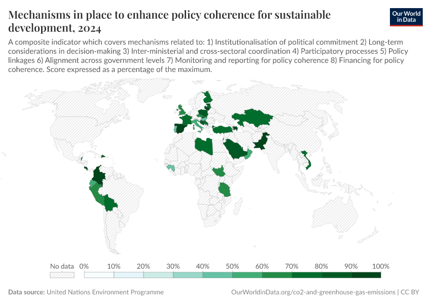 “Data Page: Mechanisms in place to enhance policy coherence for sustainable development”. Our World in Data (2026). Data adapted from United Nations Environment Programme. Retrieved from https://search-sync-local-query.owid.pages.dev/grapher/mechanisms-to-enhance-policy-for-sustainable-development [online resource]How to cite this data