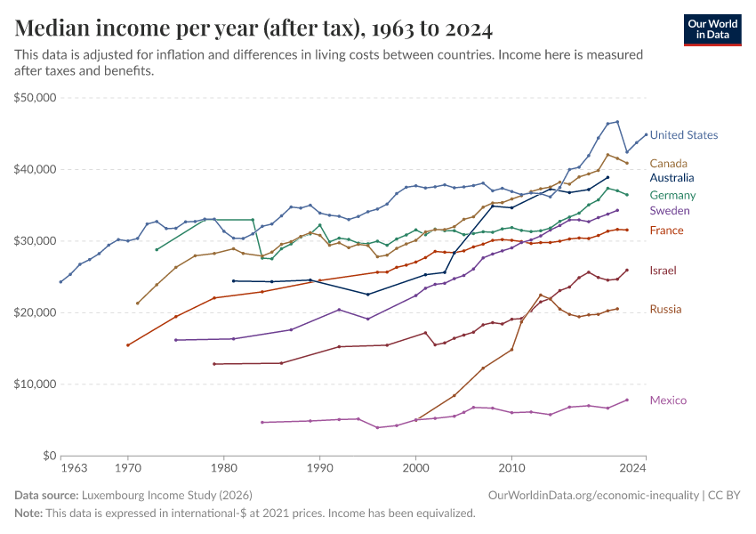 “Data Page: Median income (after tax)”, part of the following publication: Joe Hasell, Bertha Rohenkohl, Pablo Arriagada, Esteban Ortiz-Ospina, and Max Roser (2022) - “Poverty”. Data adapted from Luxembourg Income Study. Retrieved from https://search-sync-local-query.owid.pages.dev/grapher/median-income-after-tax-lis [online resource]How to cite this data