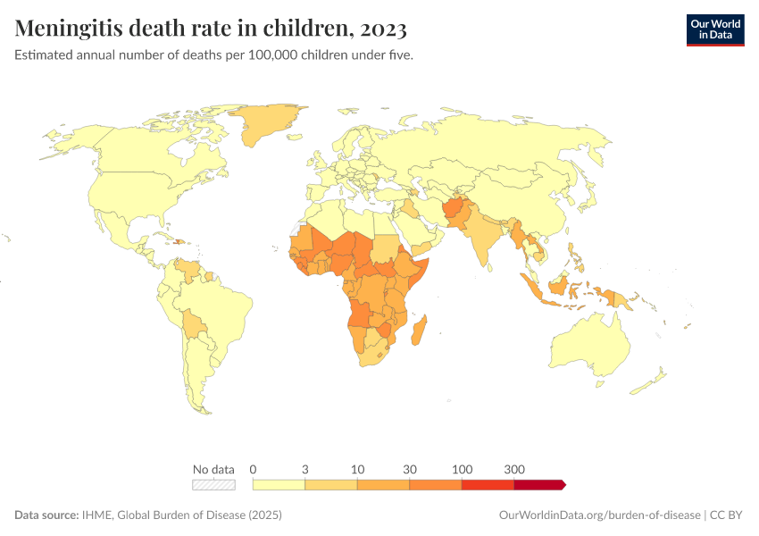 IHME, Global Burden of Disease (2024) – with minor processing by Our World in Data. “Meningitis death rate in children” [dataset]. IHME, Global Burden of Disease, “Global Burden of Disease - Deaths and DALYs” [original data]. Retrieved January 5, 2026 from https://search-sync-local-query.owid.pages.dev/grapher/meningitis-death-rates-children-under-5