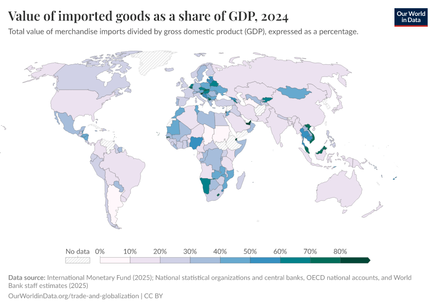 International Monetary Fund (2025); National statistical organizations and central banks, OECD national accounts, and World Bank staff estimates (2025) – with major processing by Our World in Data. “Value of imported goods as a share of GDP” [dataset]. International Monetary Fund, “International Trade in Goods (by partner country) (IMTS)”; National statistical organizations and central banks, OECD national accounts, and World Bank staff estimates, “World Development Indicators 122” [original data]. Retrieved January 5, 2026 from https://search-sync-local-query.owid.pages.dev/grapher/merchandise-imports-as-a-share-of-countrys-gdp