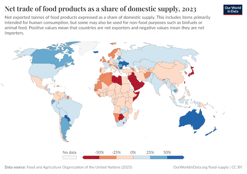 “Data Page: Net trade of food products as a share of domestic supply”, part of the following publication: Hannah Ritchie, Pablo Rosado, and Max Roser (2023) - “Agricultural Production”. Data adapted from Food and Agriculture Organization of the United Nations. Retrieved from https://search-sync-local-query.owid.pages.dev/grapher/net-food-trade-as-a-share-of-domestic-supply [online resource]How to cite this data