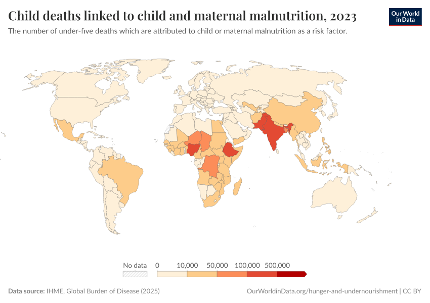 IHME, Global Burden of Disease (2024) – with minor processing by Our World in Data. “Child deaths linked to child and maternal malnutrition” [dataset]. IHME, Global Burden of Disease, “Global Burden of Disease - Risk Factors” [original data]. Retrieved January 5, 2026 from https://search-sync-local-query.owid.pages.dev/grapher/number-child-deaths-malnutrition