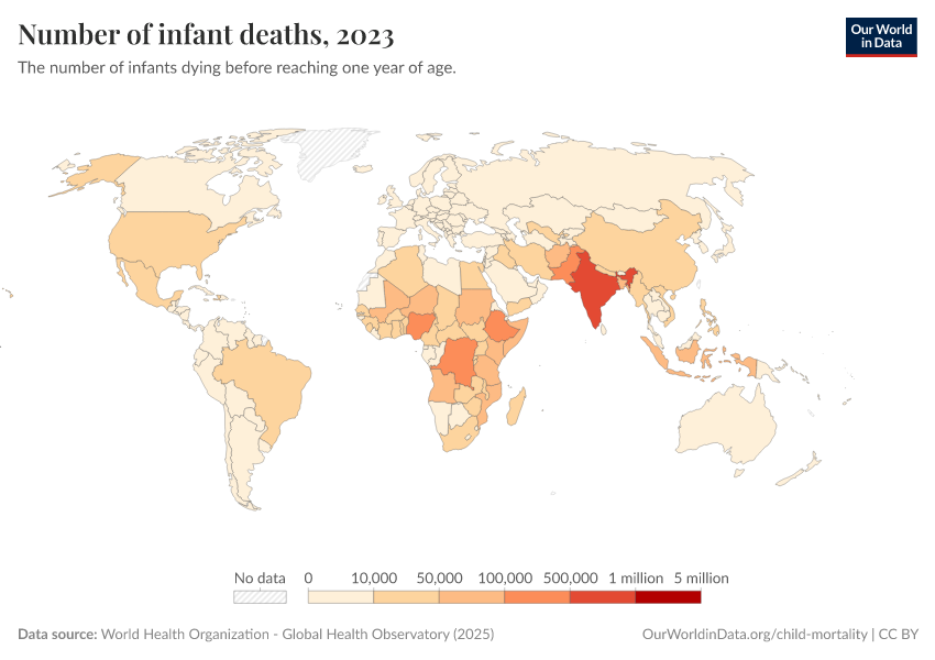 World Health Organization - Global Health Observatory (2025) – processed by Our World in Data. “Number of infant deaths” [dataset]. World Health Organization, “Global Health Observatory” [original data]. Retrieved January 5, 2026 from https://search-sync-local-query.owid.pages.dev/grapher/number-of-infant-deaths-gho