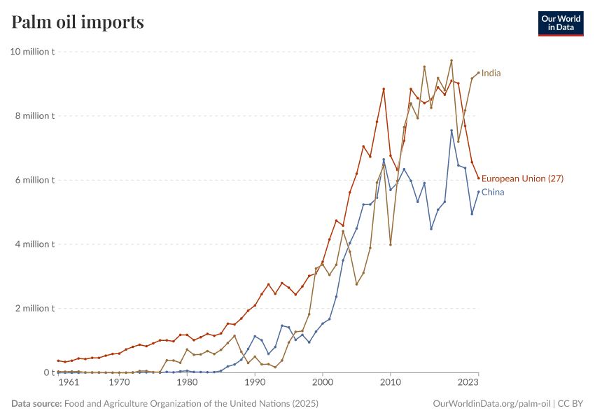 “Data Page: Imports of palm oil”. Our World in Data (2026). Data adapted from Food and Agriculture Organization of the United Nations. Retrieved from https://search-sync-local-query.owid.pages.dev/grapher/palm-oil-imports [online resource]How to cite this data