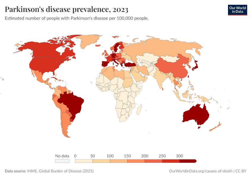 “Data Page: Parkinson's disease prevalence”, part of the following publication: Esteban Ortiz-Ospina and Max Roser (2016) - “Global Health”. Data adapted from IHME, Global Burden of Disease. Retrieved from https://search-sync-local-query.owid.pages.dev/grapher/parkinsons-disease-prevalence-ihme [online resource]How to cite this data