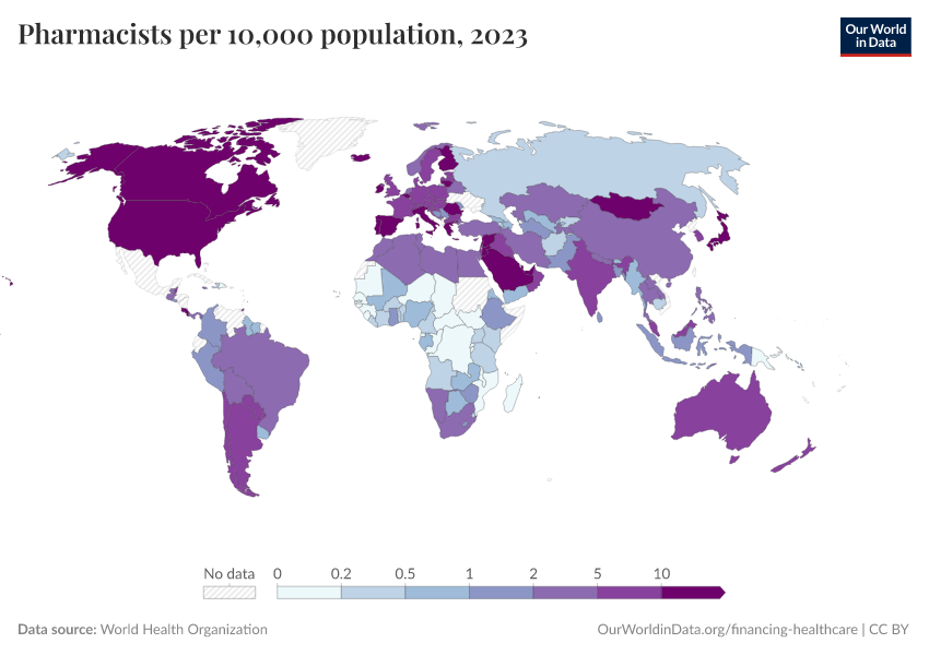 “Data Page: Pharmacists per 10,000 population”. Our World in Data (2026). Data adapted from World Health Organization. Retrieved from https://search-sync-local-query.owid.pages.dev/grapher/pharmaceutical-personnel-per-1000 [online resource]How to cite this data