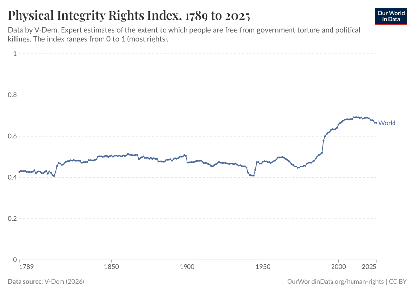 V-Dem (2025) – processed by Our World in Data. “Physical violence index – V-Dem” [dataset]. V-Dem, “Democracy report v15” [original data]. Retrieved January 5, 2026 from https://search-sync-local-query.owid.pages.dev/grapher/physical-integrity-rights-index-vdem