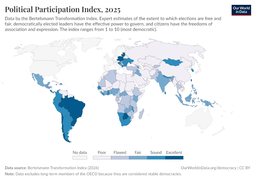 Bertelsmann Transformation Index (2024) – processed by Our World in Data. “Political Participation Index” [dataset]. Bertelsmann Transformation Index, “Bertelsmann Transformation Index, Scores” [original data]. Retrieved January 5, 2026 from https://search-sync-local-query.owid.pages.dev/grapher/political-participation-index-bti