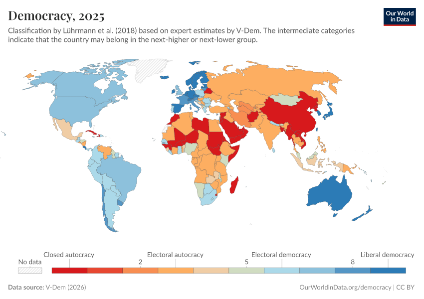 V-Dem (2025) – processed by Our World in Data. “Political regime – inc. ambiguous categories” [dataset]. V-Dem, “Democracy report v15” [original data]. Retrieved January 5, 2026 from https://search-sync-local-query.owid.pages.dev/grapher/political-regime-amb-row