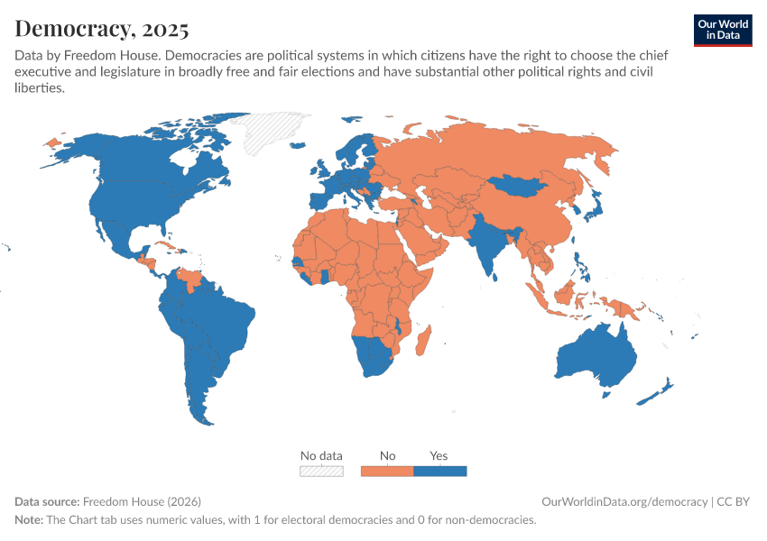 Freedom House (2025) – processed by Our World in Data. “Democracy” [dataset]. Freedom House, “Freedom in the World” [original data]. Retrieved January 5, 2026 from https://search-sync-local-query.owid.pages.dev/grapher/political-regime-dem-fh