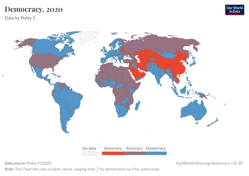- We have other democracy data sources that also cover more recent years and have more precise data. You can find them in our Key Democracy Charts and Democracy Data Explorer.