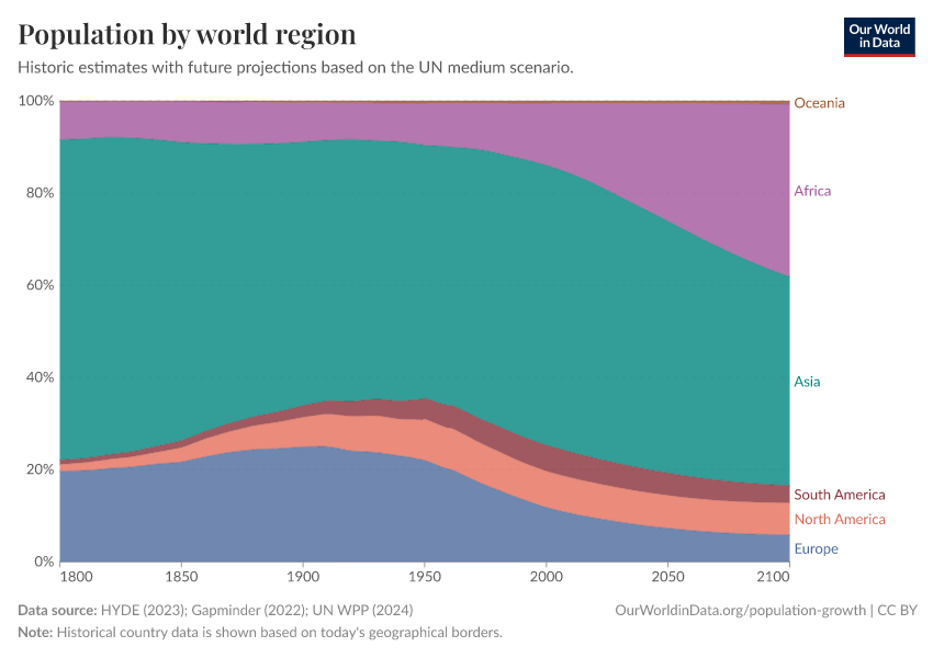 “Data Page: Population by world region”, part of the following publication: Hannah Ritchie, Lucas Rodés-Guirao, Edouard Mathieu, Marcel Gerber, Esteban Ortiz-Ospina, Joe Hasell, and Max Roser (2023) - “Population Growth”. Data adapted from PBL Netherlands Environmental Assessment Agency, Gapminder, United Nations. Retrieved from https://search-sync-local-query.owid.pages.dev/grapher/population-regions-with-projections [online resource]