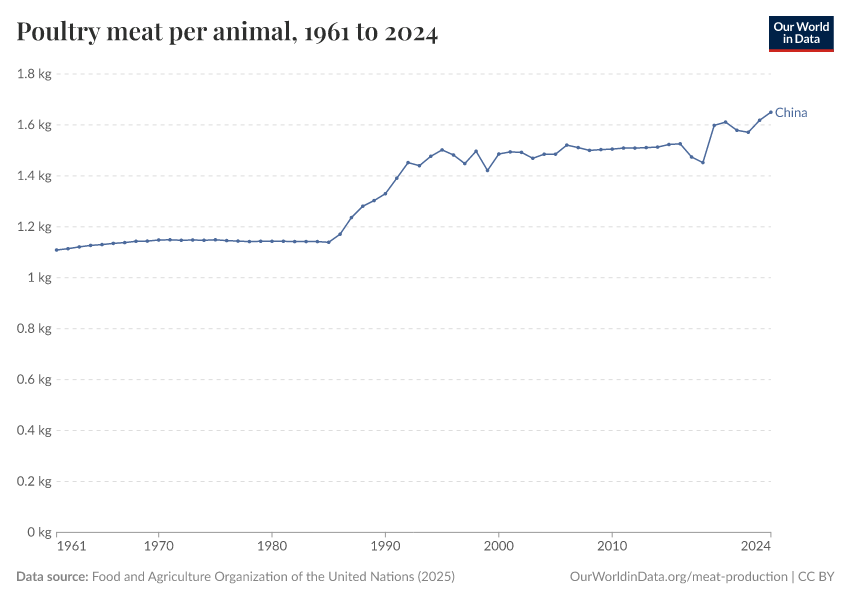 Food and Agriculture Organization of the United Nations (2025) – with major processing by Our World in Data. “Poultry meat yield per animal – UN FAO” [dataset]. Food and Agriculture Organization of the United Nations, “Production: Crops and livestock products” [original data]. Retrieved January 5, 2026 from https://search-sync-local-query.owid.pages.dev/grapher/poultry-yields-meat-per-animal