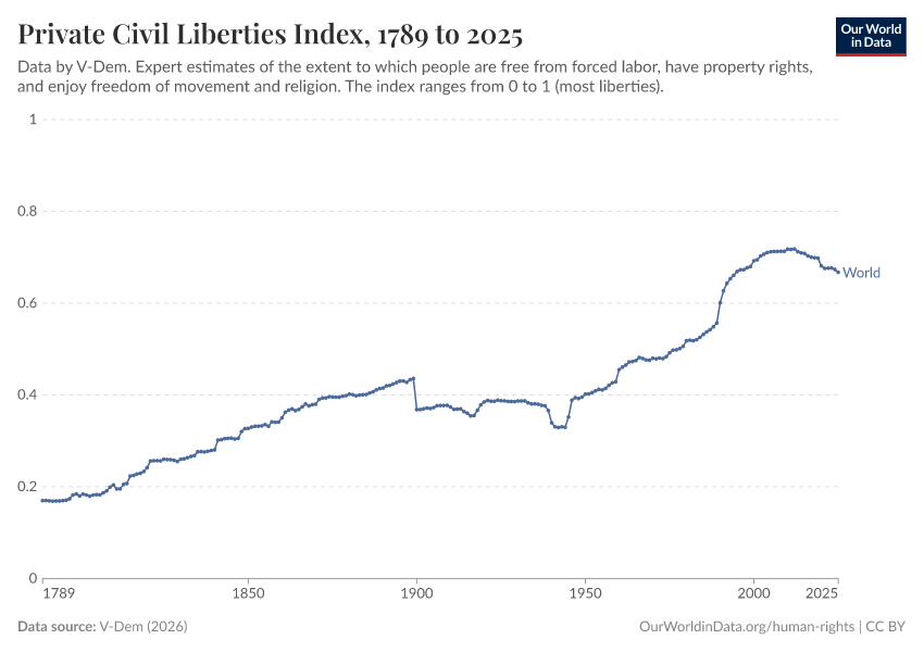 V-Dem (2025) – processed by Our World in Data. “Private civil liberties index – V-Dem” [dataset]. V-Dem, “Democracy report v15” [original data]. Retrieved January 5, 2026 from https://search-sync-local-query.owid.pages.dev/grapher/private-civil-liberties-index