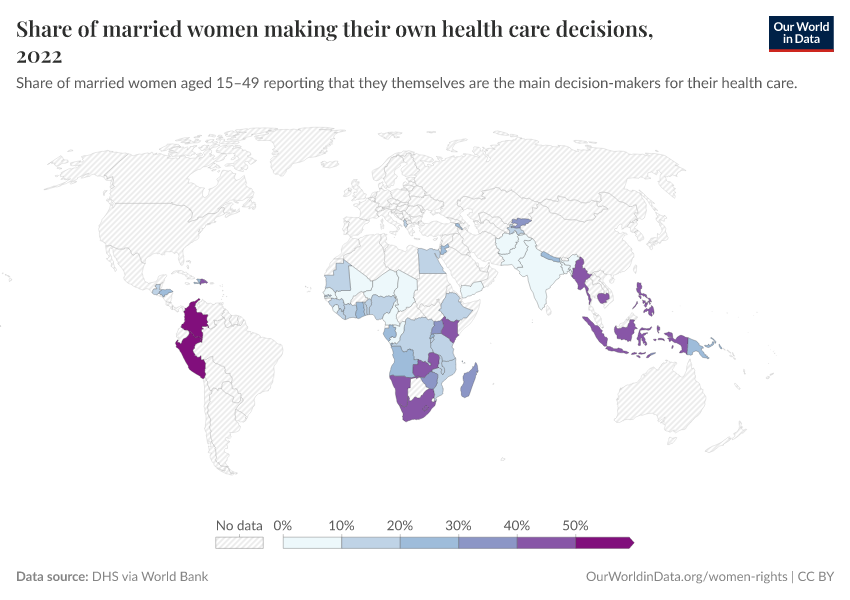DHS via World Bank – processed by Our World in Data. “Share of married women making their own health care decisions” [dataset]. World Bank Gender Statistics, “World Bank Gender Statistics” [original data]. Retrieved January 5, 2026 from https://search-sync-local-query.owid.pages.dev/grapher/proportion-of-women-who-make-their-own-informed-health-care-decisions