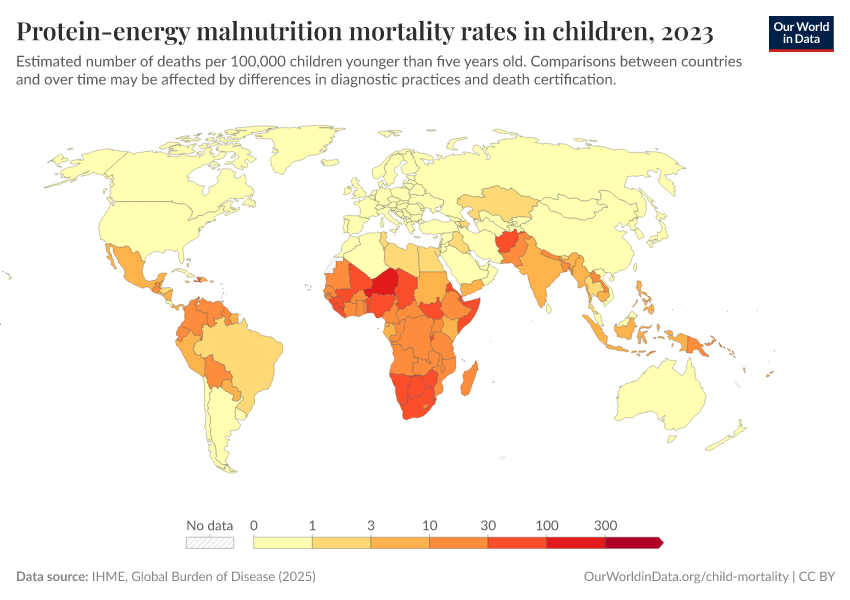 IHME, Global Burden of Disease (2024) – with minor processing by Our World in Data. “Protein-energy malnutrition mortality rates in children ” [dataset]. IHME, Global Burden of Disease, “Global Burden of Disease - Deaths and DALYs” [original data]. Retrieved January 5, 2026 from https://search-sync-local-query.owid.pages.dev/grapher/protein-energy-malnutrition-mortality-rates-in-children