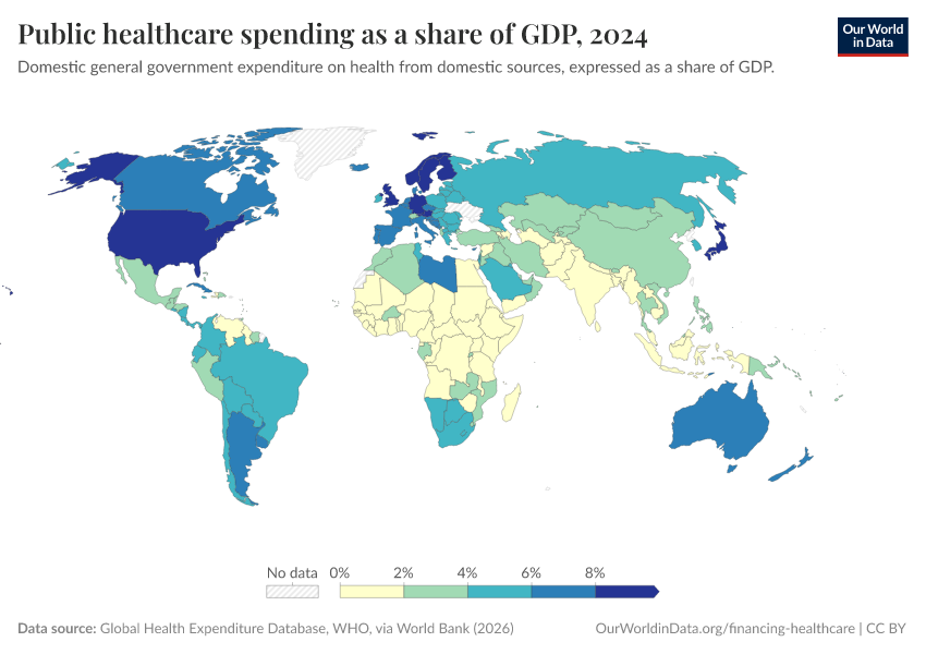 “Data Page: Public healthcare spending as a share of GDP”. Our World in Data (2026). Data adapted from World Health Organization (WHO), via World Bank. Retrieved from https://search-sync-local-query.owid.pages.dev/grapher/public-healthcare-spending-share-gdp [online resource]How to cite this data