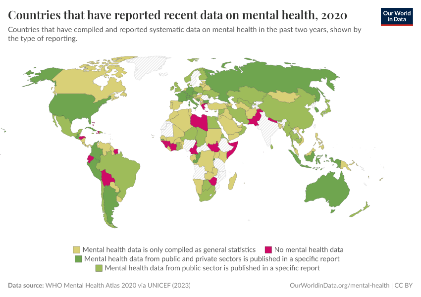 WHO Mental Health Atlas 2020 via UNICEF (2023) – with major processing by Our World in Data. “Countries that have reported recent data on mental health” [dataset]. WHO Mental Health Atlas 2020 via UNICEF, “Countdown for Global Mental Health 2030” [original data]. Retrieved January 5, 2026 from https://search-sync-local-query.owid.pages.dev/grapher/reporting-of-mental-health-system-data-in-the-past-two-years