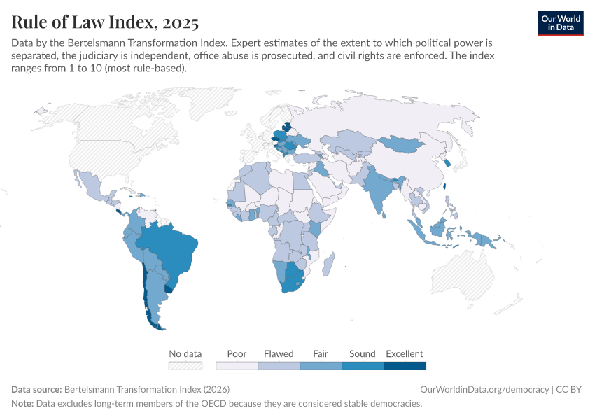 “Data Page: Rule of Law Index”, part of the following publication: Bastian Herre, Lucas Rodés-Guirao, and Esteban Ortiz-Ospina (2013) - “Democracy”. Data adapted from Bertelsmann Transformation Index. Retrieved from https://search-sync-local-query.owid.pages.dev/grapher/rule-of-law-index-bti [online resource]How to cite this data
