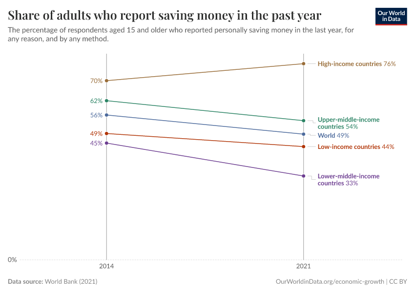 “Data Page: Share of adults who report saving money in the past year”, part of the following publication: Max Roser, Bertha Rohenkohl, Pablo Arriagada, Joe Hasell, Hannah Ritchie, and Esteban Ortiz-Ospina (2023) - “Economic Growth”. Data adapted from World Bank. Retrieved from https://search-sync-local-query.owid.pages.dev/grapher/share-of-adults-who-report-saving-money-in-the-past-year [online resource]How to cite this data