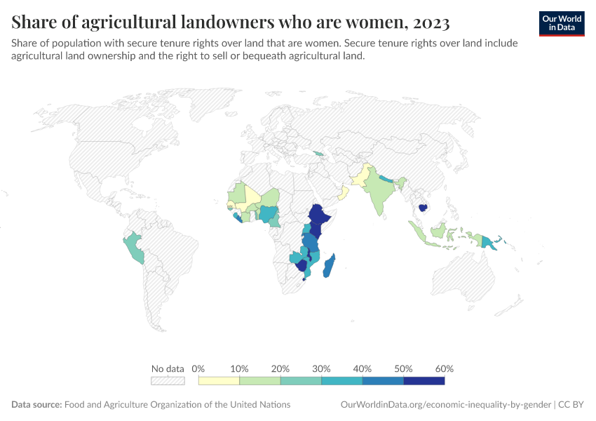Food and Agriculture Organization of the United Nations – processed by Our World in Data. “Share of agricultural landowners who are women” [dataset]. Food and Agriculture Organization of the United Nations, “Data from multiple sources” [original data]. Retrieved January 5, 2026 from https://search-sync-local-query.owid.pages.dev/grapher/share-of-agricultural-land-owners-that-are-women