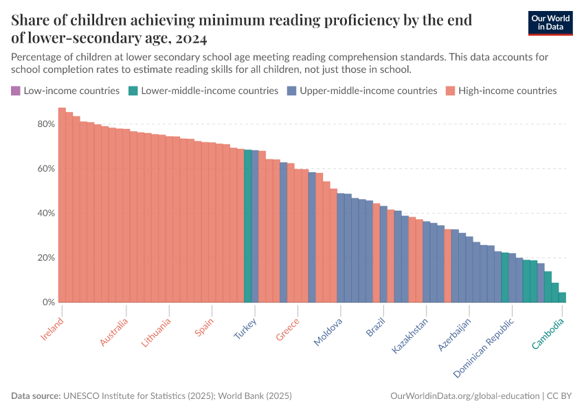 UNESCO Institute for Statistics (2025) – with minor processing by Our World in Data. “Share of children achieving minimum reading proficiency by the end of lower secondary age” [dataset]. UNESCO Institute for Statistics, “UNESCO Institute for Statistics (UIS) - Education” [original data]. Retrieved January 5, 2026 from https://search-sync-local-query.owid.pages.dev/grapher/share-of-children-reaching-sufficient-reading-comprehension-by-the-end-of-lower-secondary-age